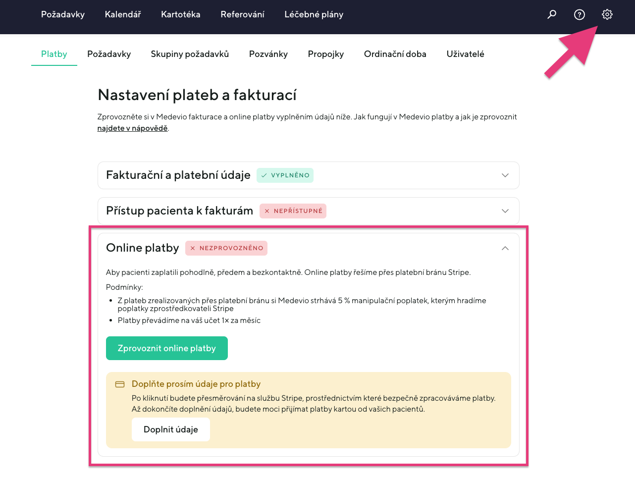 nebo v Medevio klikněte na ikonku ozubeného kolečka Nastavení na horní liště a vyberte záložku Platby.