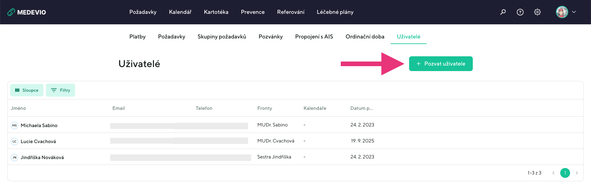 Na stránku s přehledem uživatelů vaší ordinace/kliniky se dostanete přes Nastavení kliniky ⚙️ → Uživatelé.