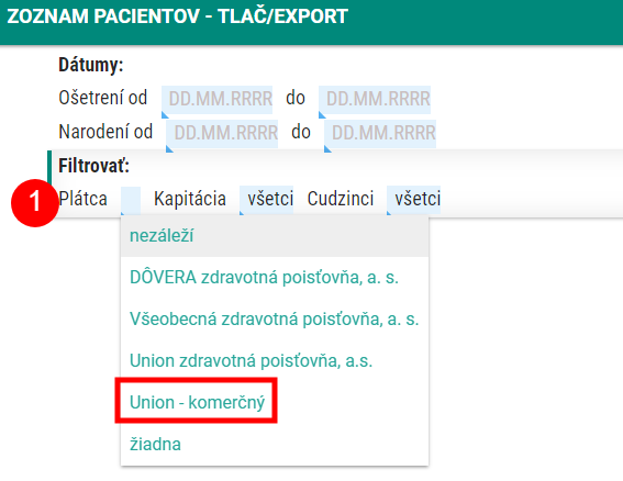 k dispozícii je filter, v ktorom je možné vybrať pacientov podľa konkrétnej zdravotnej poisťovne (v našom prípade 77 - Union - komerčný)