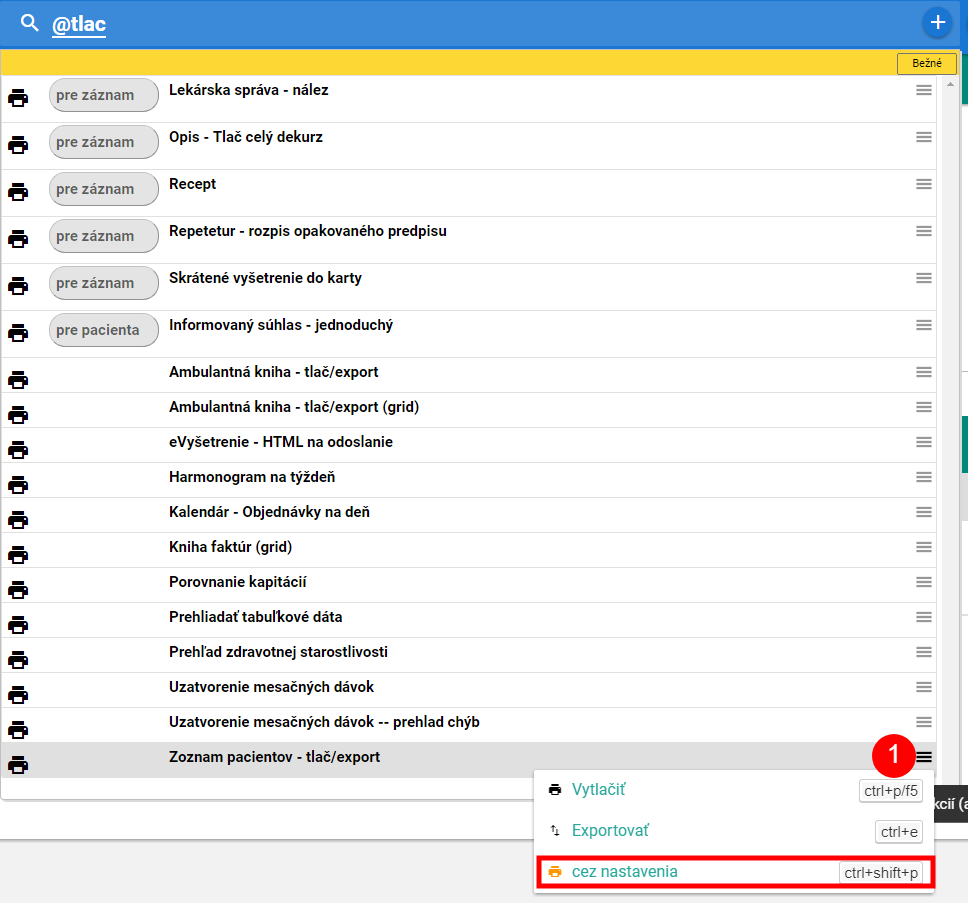 následne je potrebné kliknutím na pravý horný roh tlačovej zostavy Zoznam pacientov - tlač/export vybrať možnosť cez nastavenia